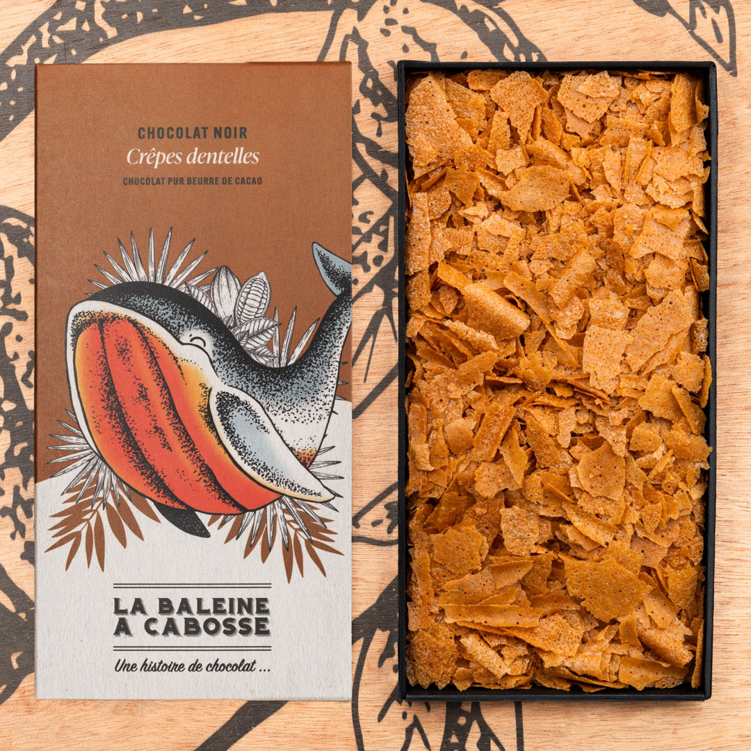 Tablette de chocolat noir & crêpes dentelles fabriquée dans notre atelier bean-to-bar. Le mariage du chocolat aux crêpes dentelles bretonnes prend le nom de feuillantine : nous avons choisi un dosage parfaitement régressif qui fait naviguer cette tablette entre le carré de chocolat et le biscuit d’enfance. Un régal ! Notre chocolat est pur beurre de cacao, il ne contient aucune lécithine, ni additif.